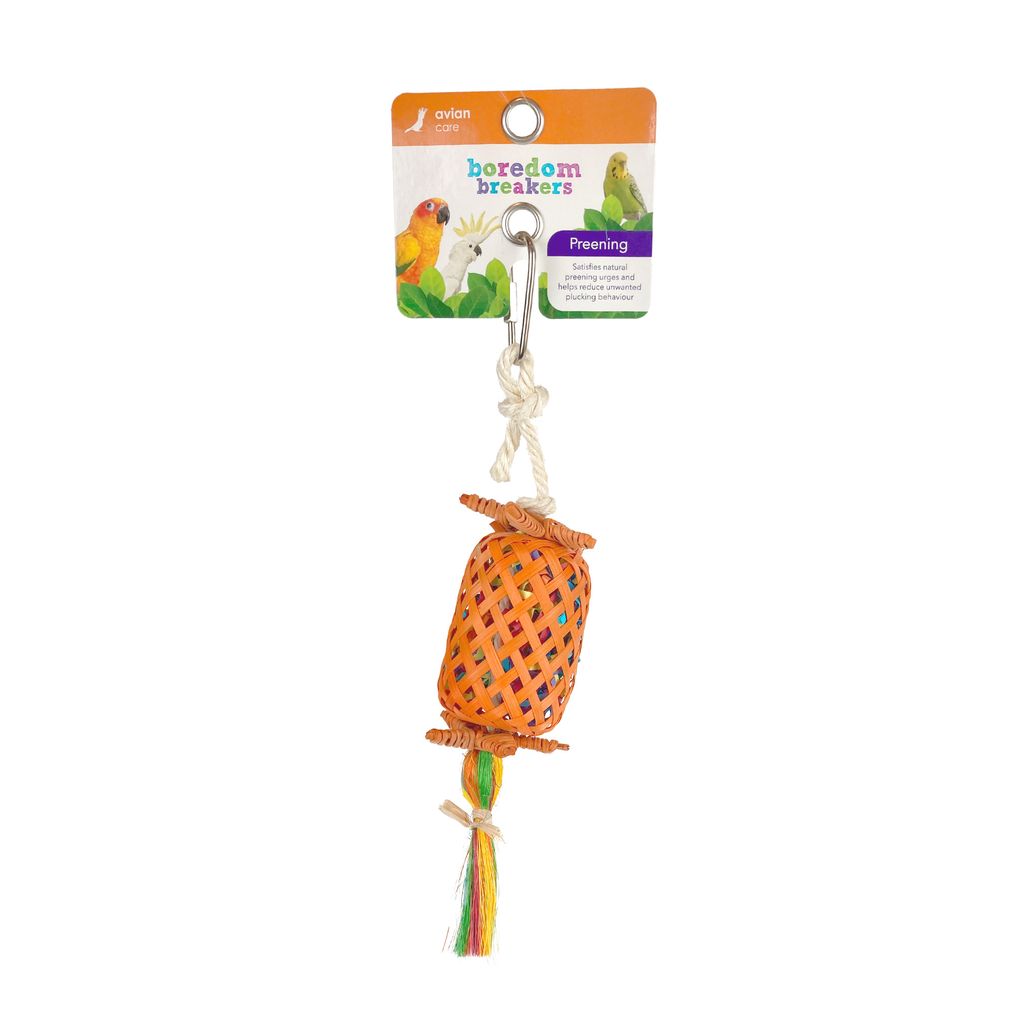 The Lantern Piñata Bird Toy (20cm) is a fun, chewable toy made from palm leaf and filled with shreddable fibres – perfect for foraging, beak exercise, and colourful cage enrichment.